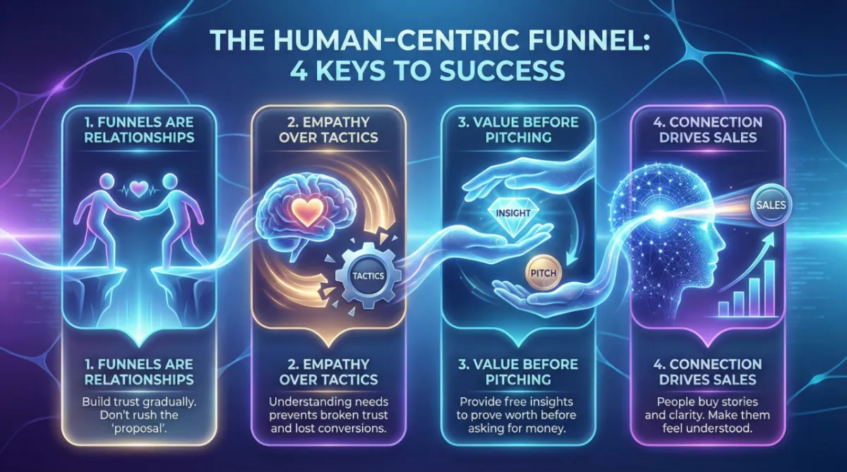 The Relationship: Slow down. We replace the "hard sell" with a trust-building journey that feels natural, not forced.